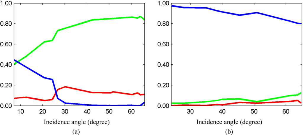 From Figure 5a, it seems the perspective that volume scattering dominates in dense natural forests only holds when the incidence angle is larger than a value, for example, 18°. When the incidence angle is medium or large, PV/Pspan can be over 0.75 and double-bounce is much stronger than surface scattering. However, if the incidence angle is smaller than a value, like 26°, with the decreasing of incidence angle, PV/Pspan drops quickly, at the same time, PS/Pspan goes up fast and surpasses PD/Pspan. If the incidence angle is smaller than 10°, PS/Pspan could be even larger than PV/Pspan.