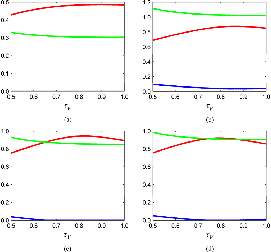 From the sub-figures in Figure 6, we could know P1 is a monotonous decreasing function of τV. The relationship between P0 and τV is more complex: P0 first monotonously increases with τV until reaches a peak at τV = τV_0, then monotonously decreases with τV.