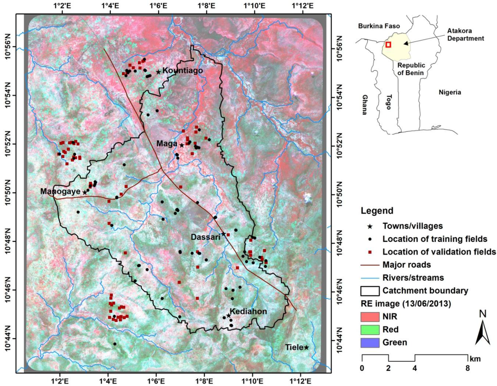 In this study, high resolution multi-temporal optical (RapidEye) and dual polarimetric (VV and VH) radar data (TerraSAR-X) have been combined to map crops and crop groups in northwestern Benin, West Africa. Excessive cloud cover during the main cropping season in West Africa has, for many years, hindered crop mapping efforts in the sub-region due to the unavailability of satellite images. A recent study [12] conducted in the sub-region with multi-temporal RapidEye images identified poor image temporal coverage as the limiting factor in accurately discrimination between certain crop types. A further limiting factor is the heterogeneity (small patches of different land use and land cover types) of the landscape [35], which leads to spectral confusion between classes, especially when per-pixel approaches are employed [36]. In order to reduce this confusion, a field-based classification approach was employed [37,38]. Vector field boundaries were derived through image segmentation. A per-pixel classification result was then overlaid and the modal class within each field assigned to it.