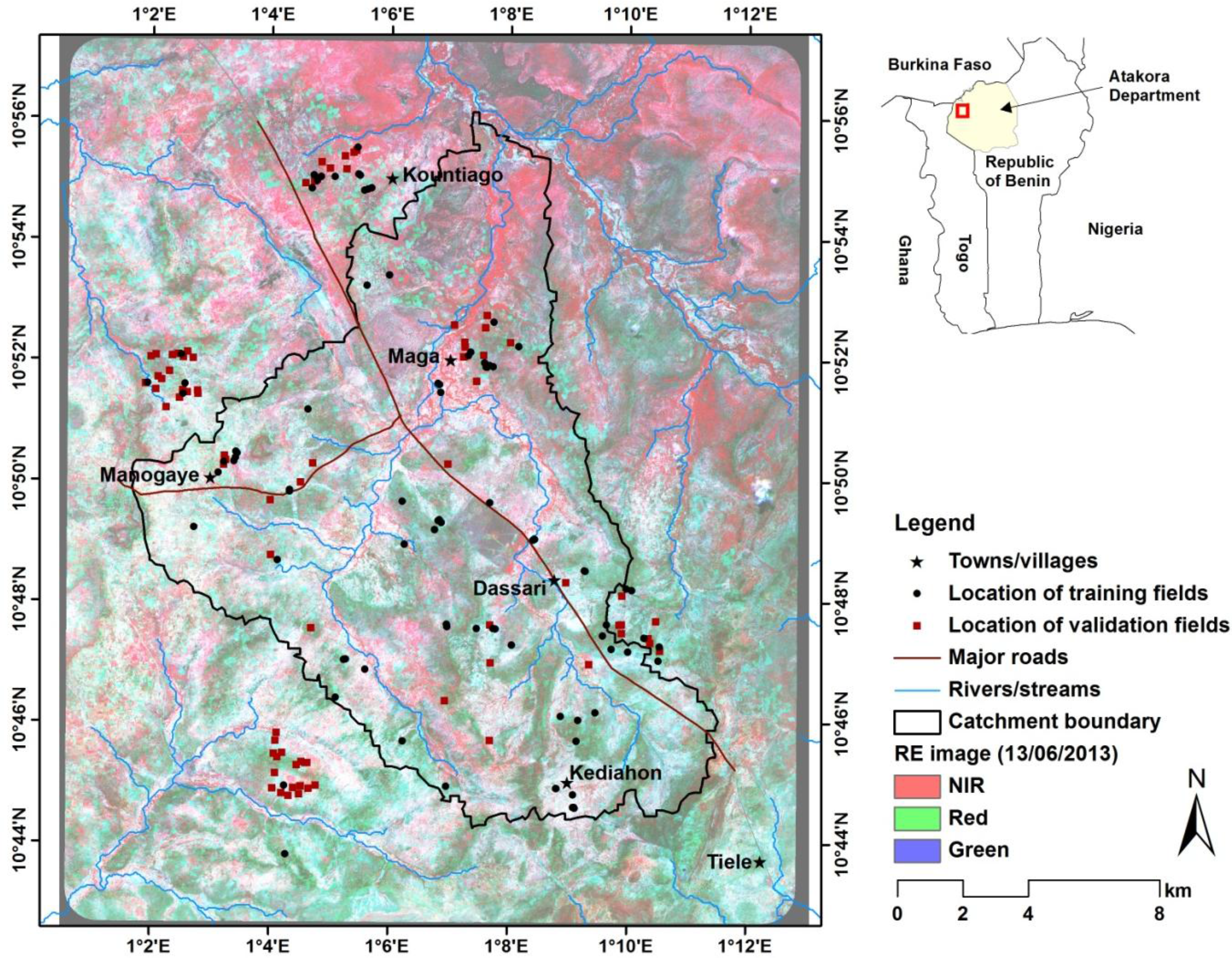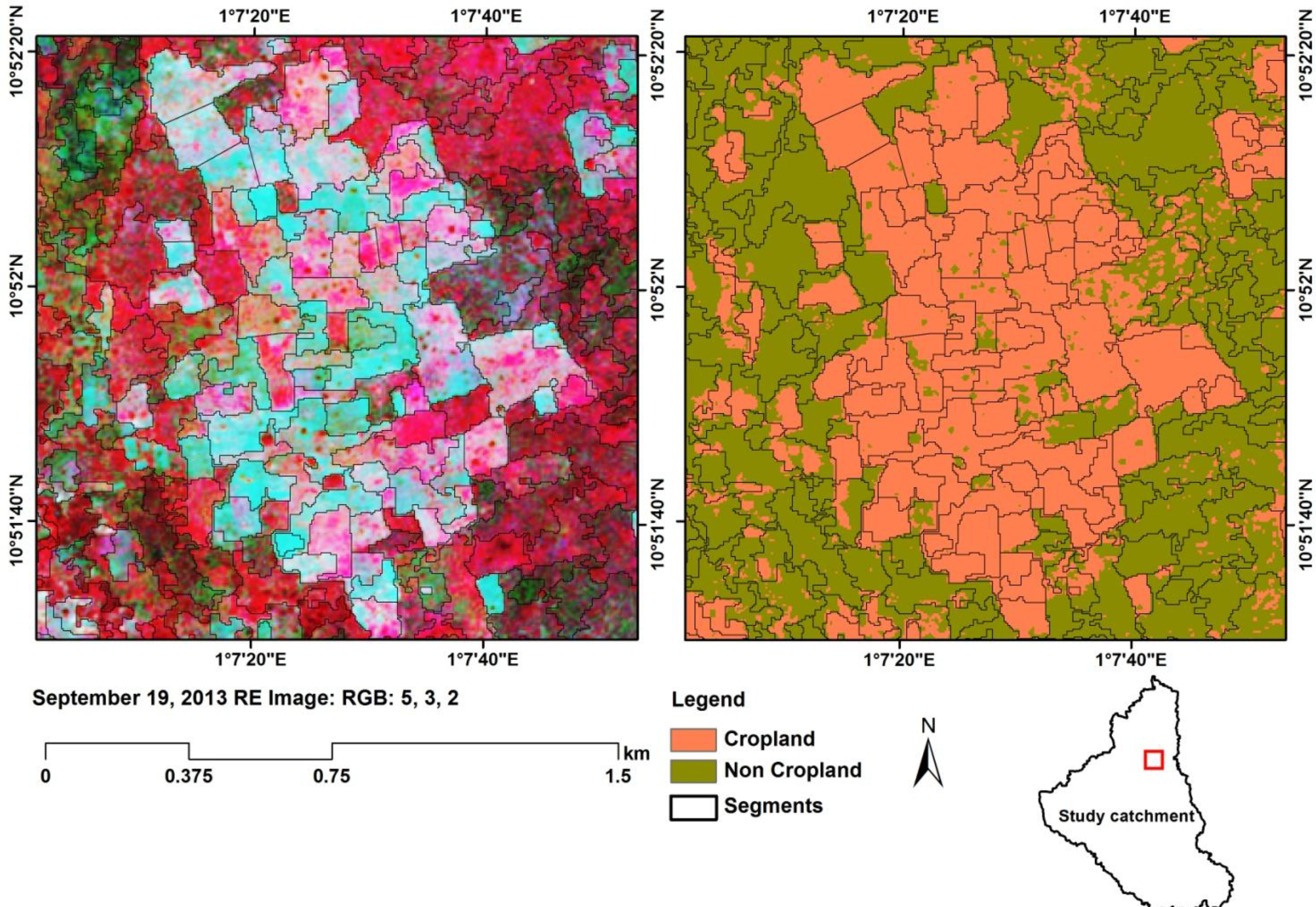 A cadastral map showing the field boundaries in the study area does not exist. Therefore, field boundaries were derived from the RE image acquired on 19 September. This image was chosen because it presented the best contrast between fields, which can be attributed to structural differences between the different crops at the time of acquisition. For example, maize fields, which are generally cultivated later in the season (late July/early August), will, by mid-September, be at the mid-vegetative stage, while millet/sorghum, which are planted much earlier in the season (May/June), would be at the seed development/senescence stage.