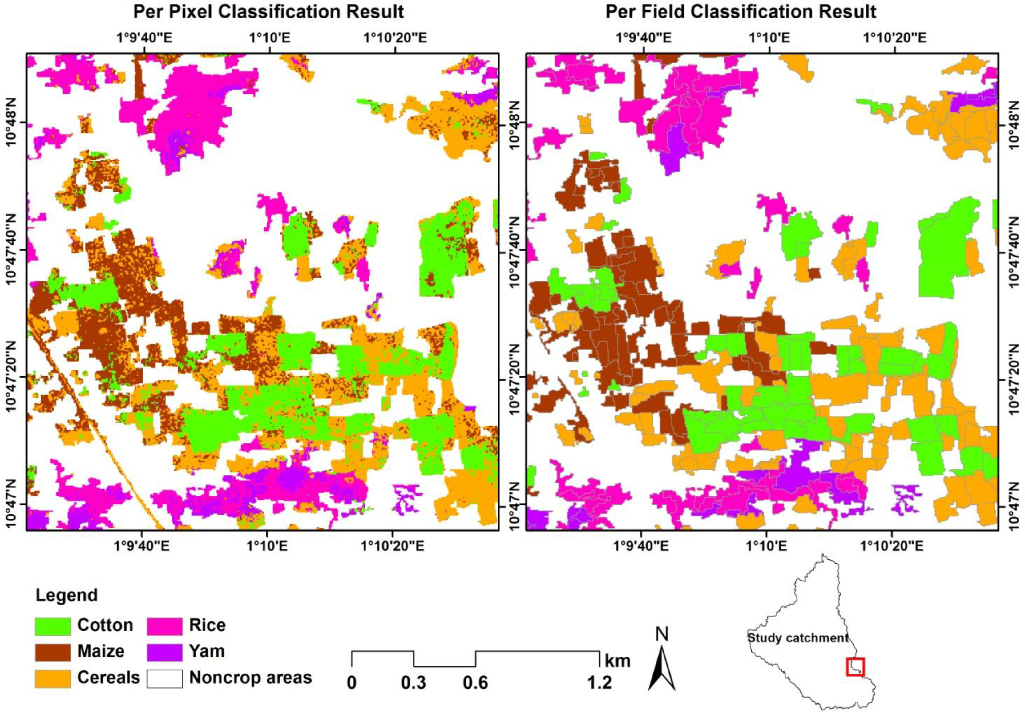 Table 8 shows the results obtained for Experiment (D). An overall accuracy of 75% was achieved. Here, all available RE and TSX time-series were considered in the classification. Class-wise accuracies (producer’s, user’s, F1 score) were better than all other experiments. An F1 score of at least 0.7 was achieved for all classes, except yam. Cotton, like in all previous experiments, had the best class accuracy (F1 score = 0.86), followed by cereals, rice and maize. These improvements can be attributed to the use of all the available RE and TSX time-series, which covers the full cropping season. Figure 10 provides a detailed look of the per-pixel and per-field results obtained for this experiment.