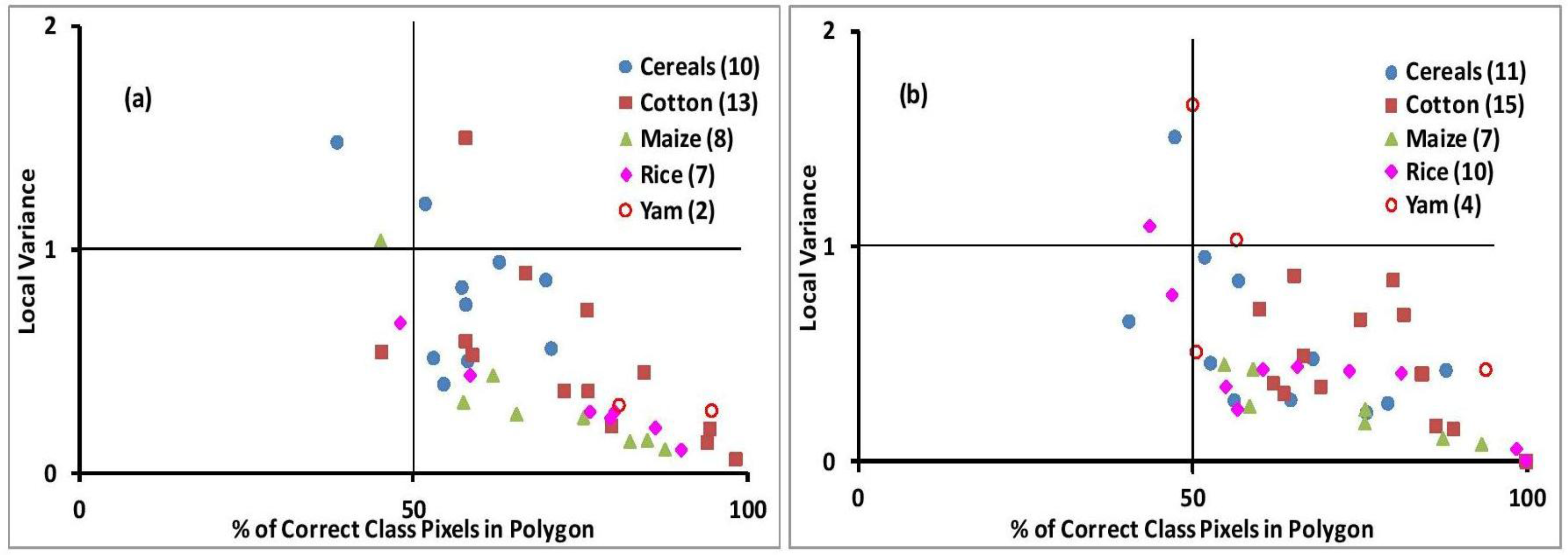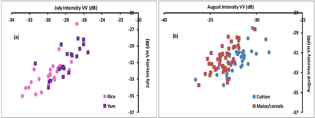 (a) Feature space plot of yam and rice using VV and VH polarizations of the July TSX acquisition; (b) similar plot as in (a) for cotton and maize/cereals using VV and VH polarizations of the August TSX acquisition.
