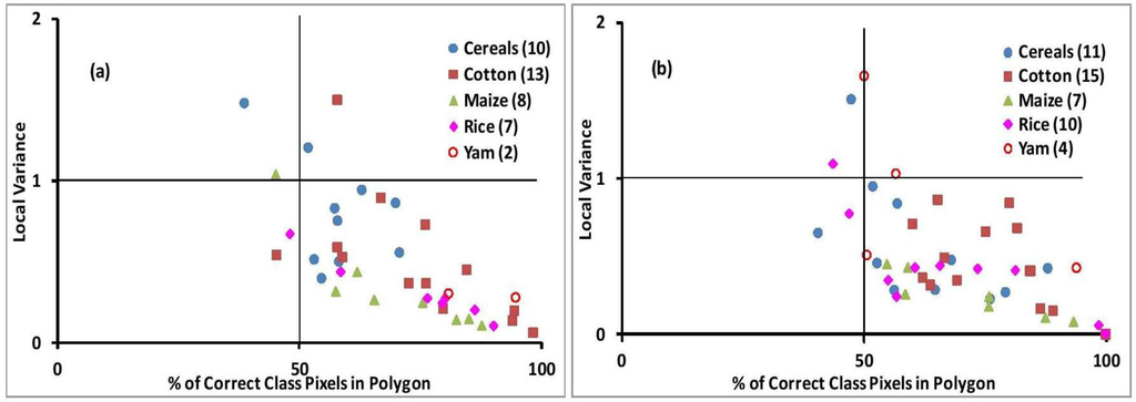 In this study, the proportion of the modal class in each correctly classified field was analyzed together with the local/within field variance (i.e., a measure of the number of classes). The objective is to ascertain the reliability of the approach adopted (modal class assignment) and to gauge the interclass confusion in the per-pixel classification result within each field. This analysis was conducted for Experiments (A) (without radar) and (B) (with radar) due to similar patterns in Experiments (B) and (D). Figure 12a,b presents a plot of the proportion of modal class against local variance per each correctly classified field for the two experiments. The number of correctly classified fields per crop type is indicated in parenthesis. The plots reveal that the proportion of modal class for most correctly classified polygons exceeded 50% in both experiments.