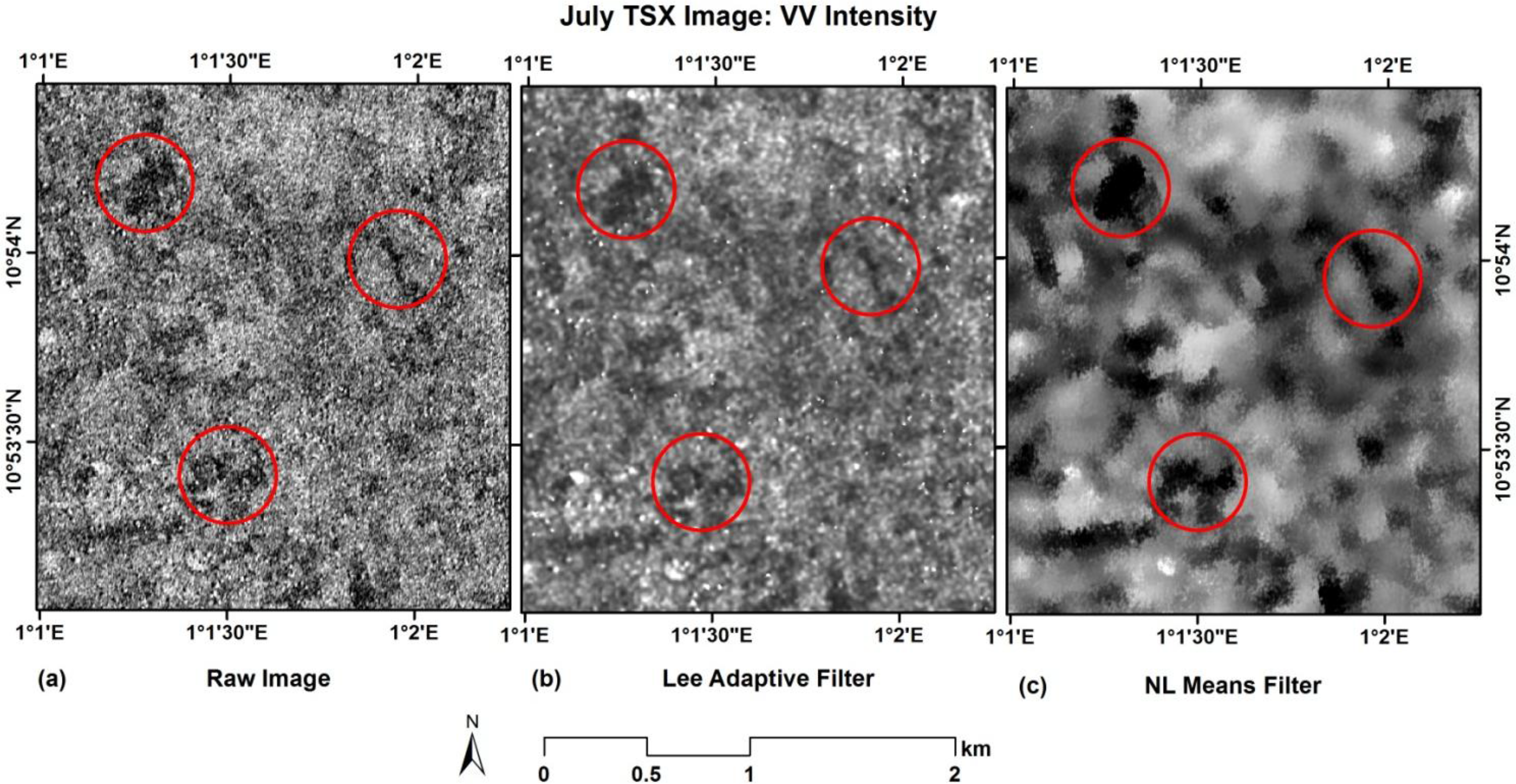 Comparison between (a) a raw TSX image, (b) a corresponding image filtered with the Lee adaptive filter (window size of 7 × 7) and (c) a non-local means (NLM) filtered image (similarity window of 9 × 9 and search window of 21 × 21).