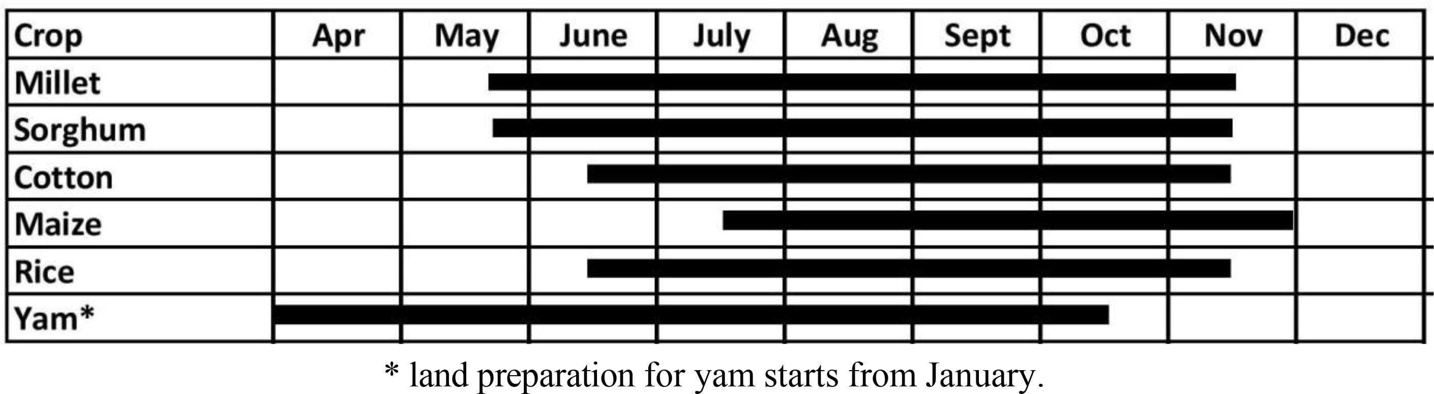 Cropping calendar for each of the crops considered in the study based on 2013 field surveys. Each bar represents the start of land preparation to the harvest period. The start or the harvest period indicated may differ by up to two weeks or more.