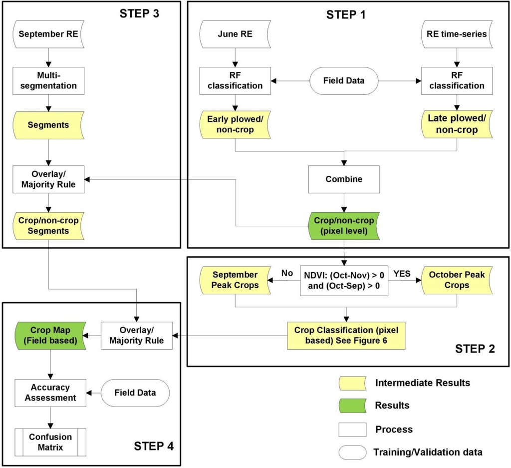 Schematic of the methodological approach. Analysis was conducted in the order indicated by the steps. RE, RapidEye; RF, random forest.
