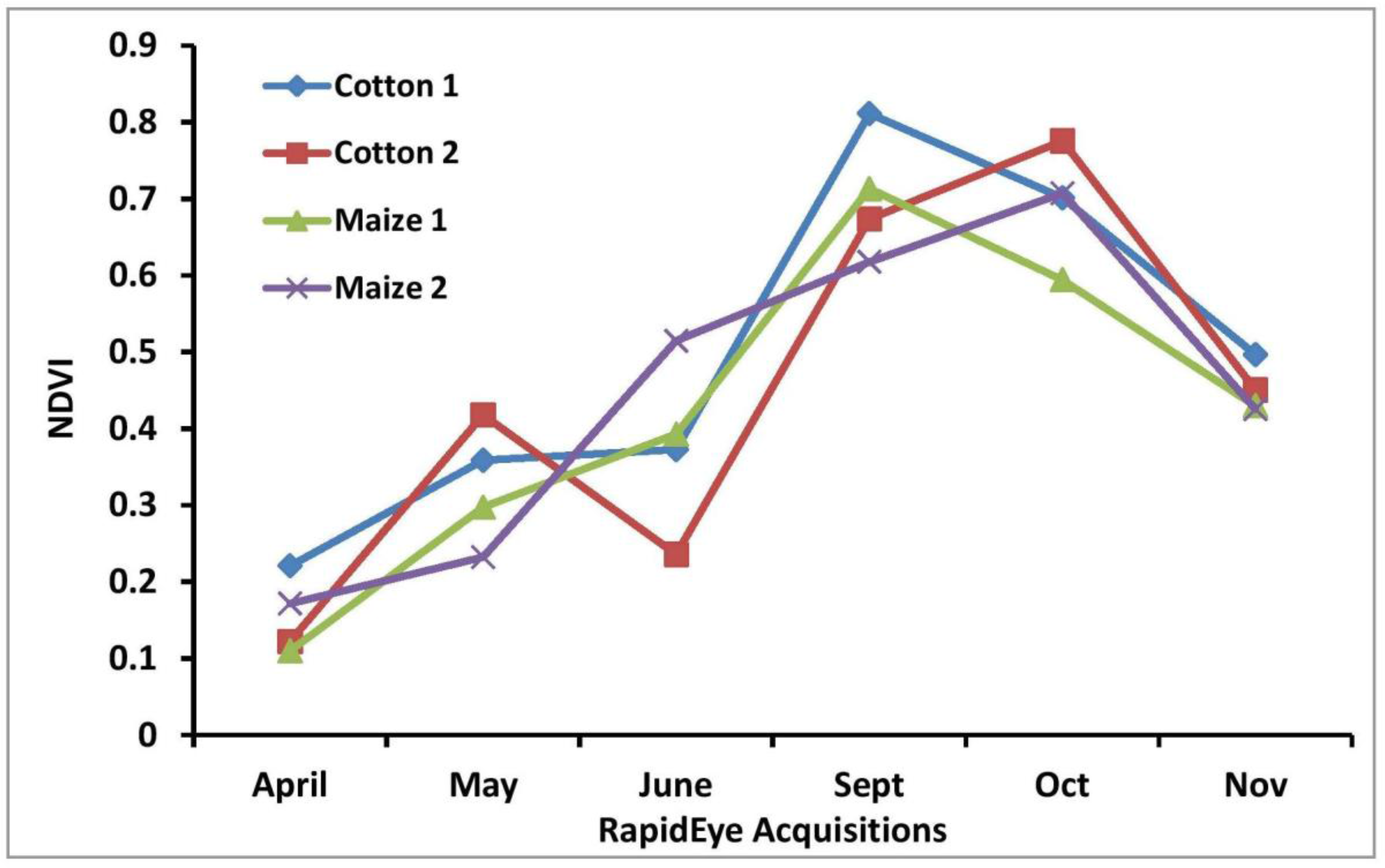 A study of the RE NDVI temporal profiles of the training data revealed that variable planting dates of the same crops, which leads to temporal within-class variability, was possibly the cause of the confusion. As depicted in Figure 5, two cotton fields (Cotton 1 and 2) exhibit different temporal profiles, with one having a peak in September and the other in October. Maize 1 has a temporal profile similar to that of Cotton 1, with both having a peak in September. Farmers in the study region subjectively decide on when to plough and seed. Some farmers plant late in the season, due to poor rains, while others still follow the traditional cropping calendar regardless of the amount of rainfall received. This situation could lead to different crops (e.g., Cotton 1 and Maize 1) exhibiting similar phenological profiles, while the same crops (e.g., Cotton 1 and Cotton 2) would exhibit different phenological profiles. The authors of [68] identified similar challenges (temporal within-class variability), especially for rice cultivation, in the Khorezm region in Uzbekistan, Central Asia. They noted that temporal segmentation of MODIS time series results in a better representation of crops that exhibit temporal variability in phenology. However, temporal aggregation of information was impossible for this study, due to the heterogeneity of the time series available here (SAR and optical data, irregular acquisitions).