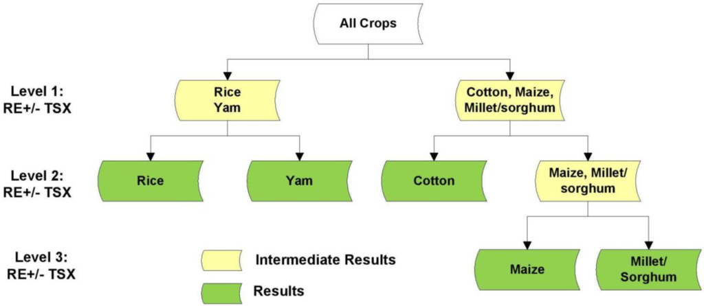 Figure 6 details the classification approach adopted to classify the five crop types on each of the masks described above. A three-level hierarchical scheme was implemented to sequentially differentiate the different crop types. At each level, several band/image combinations were tested (depending on the experiment being conducted; Section 4.2.1) during classification to determine the optimal combination for discriminating the classes under consideration. At the first level, an RF classification was performed to separate two broad crop groups (rice/yam and cotton/maize/cereals). These two crop groups were determined based on the results of an initial one-time classification involving all crops, which revealed little confusion between the two groups. A mask was created for each group for subsequent analysis. At the second level, different RF classifications were performed to separate yam from rice and cotton from maize, millet and sorghum. A final classification was conducted at the third level to separate maize from millet/sorghum (cereals). Results obtained for individual crops at Levels 2 and 3 were combined into a final crop map (at the pixel level). A corresponding per-field crop map was produced by overlaying the per-pixel crop classification results with field boundaries derived through image segmentation (Section 4.3). The modal crop class within each field boundary was assigned to it.
