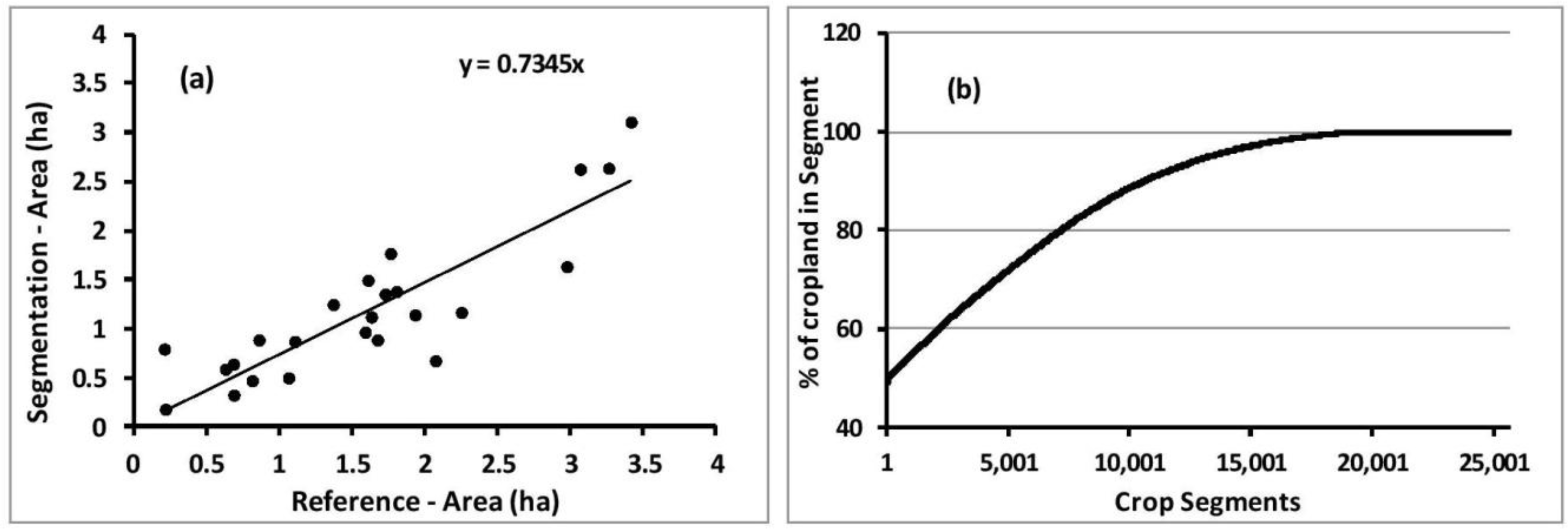 (a) The manually-digitized fields’ (reference) versus segmented fields’ (b) proportion of cropland pixels in segments classified as cropland. Percentages have been sorted in ascending order.