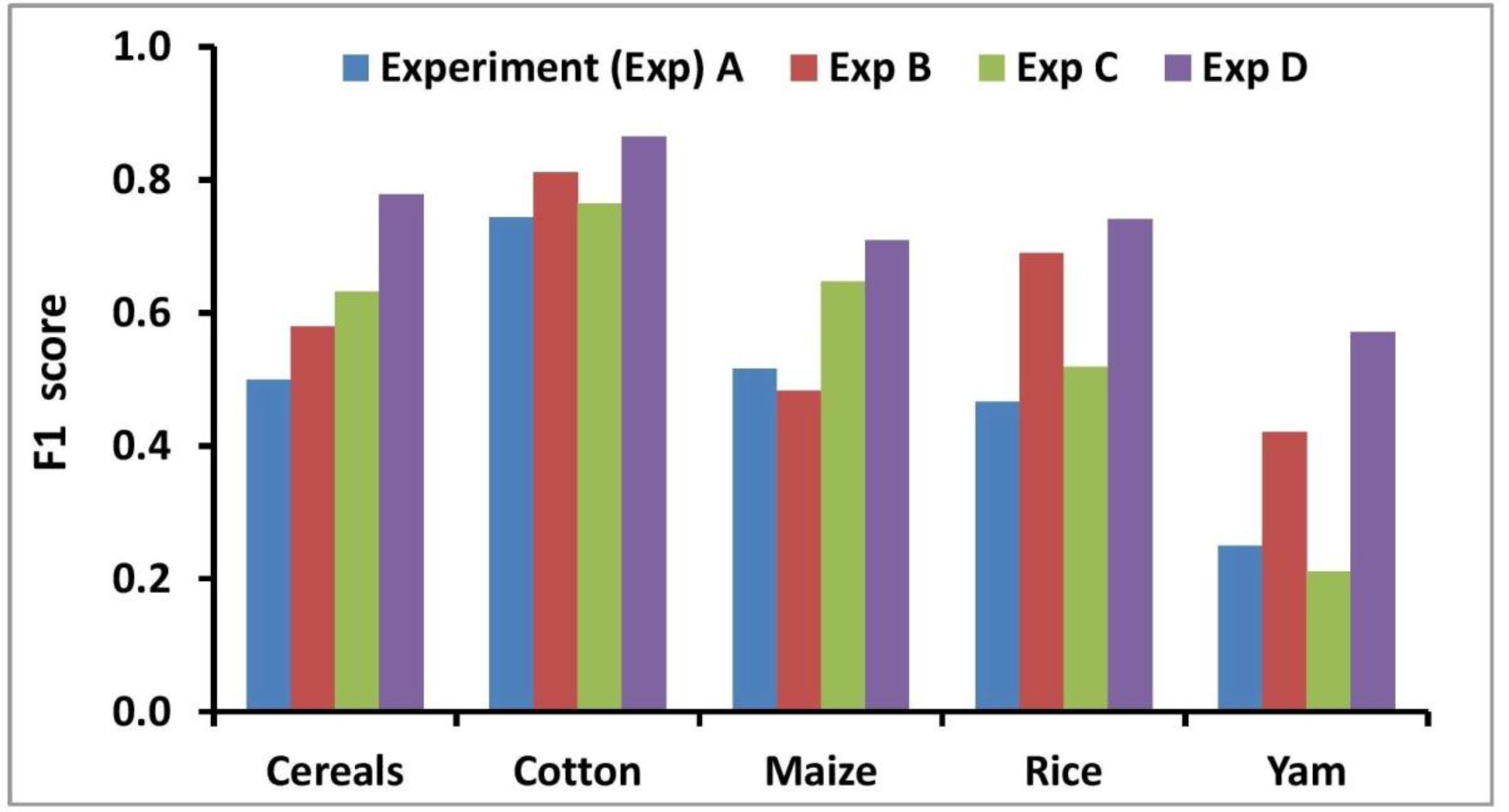 Comparison of the F1 score achieved for the various crops in the four experiments.