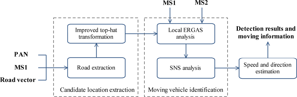 The proposed method consists of an automatic processing chain. The required input is WV2 images and road vector data. The flow diagram of our method is shown in Figure 1. As a first step, roads are extracted by geo-referencing image to road vector data. Vegetation and shadow regions are eliminated to reduce false-alarm hypotheses. Then, we use an improved top-hat transformation to get the vehicles’ candidate locations. The next step is to identify moving vehicles. We perform band selection by both visual inspection and quantitative analysis, and three spectral band pairs appropriate for moving vehicle identification are selected. Then, a SNS method incorporating the ERGAS analysis (ERGAS-SNS) approach is utilized to identify moving vehicles. Finally, the vehicle’s displacement between MS1 and MS2 images can be extracted by ERGAS-SNS analysis. The speed and directions of movement are then calculated using the displacement and the time lag between MS1 and MS2 images.
