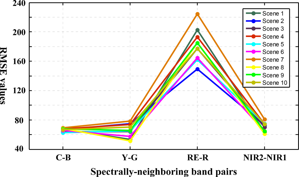 Besides visual inspection, we performed the quantitative analysis by using root mean squared error (RMSE) analysis. RMSE is capable of measuring the global spectral distortion between two spectral bands. It exhibits a strong tendency to decrease when the spectral differences between the spectrally-neighboring bands decreases. As shown in Figure 12, the RMSE values of RE-R are dominantly high, whereas the RMSE values of other spectral band pairs are low. Based upon the above analysis, we conclude that the spectral band pair of RE-R is not suitable to identify moving vehicles.