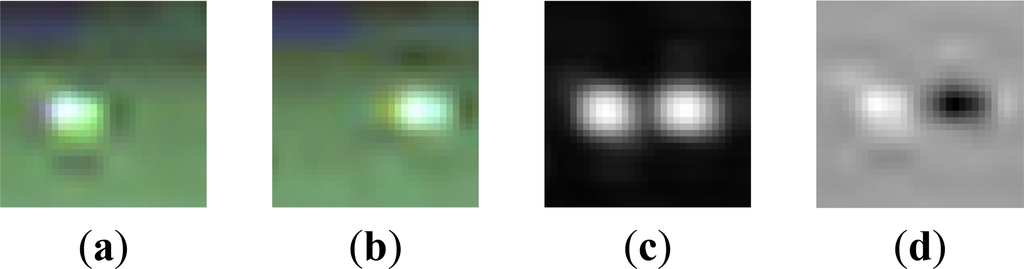 where med denotes the standard median operator, p is the pixel position, M1 denotes the composite MS1 band group (blue, green and NIR1) and M2 denotes the composite MS2 band group (coastal, yellow and NIR2). After change score calculation, the bright spot pair generated by ERGAS analysis would turn into a positive-negative pair in the change score map, as shown in Figures 13 and 14. This pair can be considered as a moving vehicle if and only if: