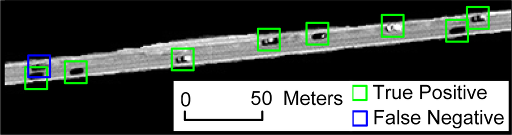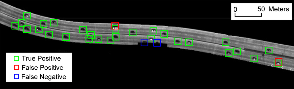 Scene 2 presents part of some suburban roads. As can be seen from Figure 17, no false alarms were found, while one vehicle is missed. The missed car is close to another car, and the two cars’ hypothesis points unite together. Thus, insufficient image resolution influences the accuracy of vehicle detection.