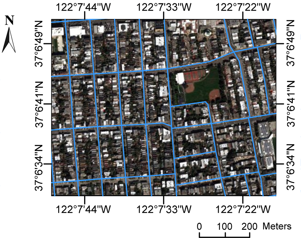 Image-to-vector geo-referencing of WorldView-2 imagery. This is one part of the Richmond District. The blue lines represent the road network.