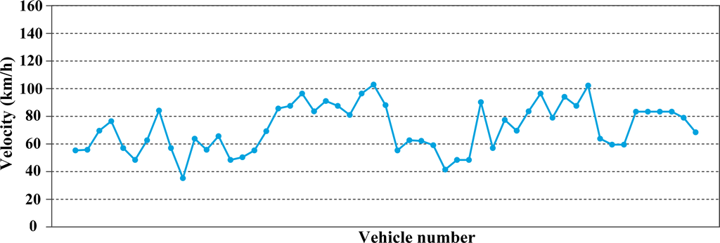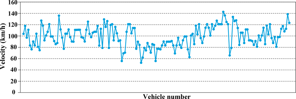The speed estimation results of 166 moving vehicles for highway segments are as shown in Figure 22. The max speed of these vehicles is about 142 km/h, and these vehicles have an average speed of 99 km/h. Meanwhile, the speed estimation results of 53 moving vehicles for suburban roads are as shown in Figure 23. These vehicles have an average speed of 70 km/h. This means that vehicles on highways run faster than vehicles on suburban roads. The results show that the speed estimation results are in accordance with actual conditions.