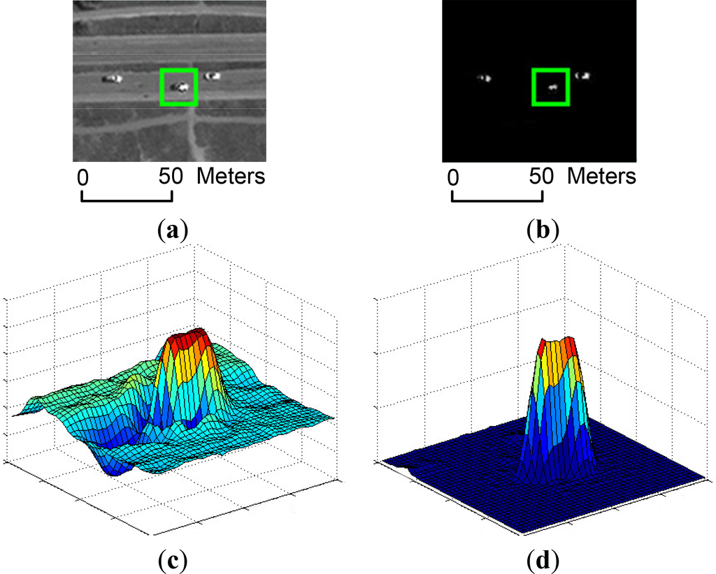 WTH finds the bright regions in the image, while BTH finds dark regions. Vehicles are usually elliptical bright (dark) blobs in panchromatic images, and WTH and BTH can be directly used to find a moving vehicle. However, the classical top-hat transformation cannot differentiate the heavy clutter and real vehicle region. If there are cluttered backgrounds, most of the clutter will have outputs in the result image. In Bai’s work [17], an improved top-hat transformation is proposed for infrared dim small target detection. We follow that with the proper selection of structuring elements based on the vehicle’s properties. If the structuring elements are properly chosen, the difference between vehicles and the background can be enhanced, and the performance of vehicle detection will be significantly improved. In light of this, a new moving vehicle detector is proposed.