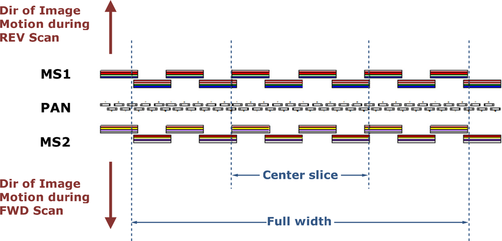 The WV2 satellite carries a PAN and two MS (MS1 and MS2) sensors onboard. The PAN sensor is located between the MS1 and MS2. MS1 consists of red, green, blue and NIR1. MS2 consists of red edge, yellow, coastal and NIR2. The focal plane layout of WV2 [18] is shown in Figure 9. Due to the hardware arrangement, the sequence of collected images is MS1, PAN and MS2 with approximately a 0.13-s time lag between each MS and the PAN image. Therefore, the time lag between MS1 and MS2 is approximately 0.26 s [1].