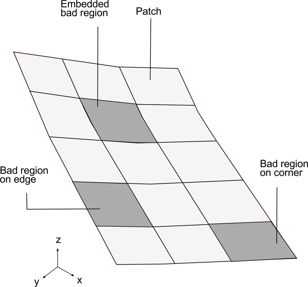 The method described here repairs the bad regions that are completely embedded into the DTM and those occurring on the edges. There is not enough information to reliably repair the bad regions occurring at the corners. To repair the bad regions, the following steps are taken: