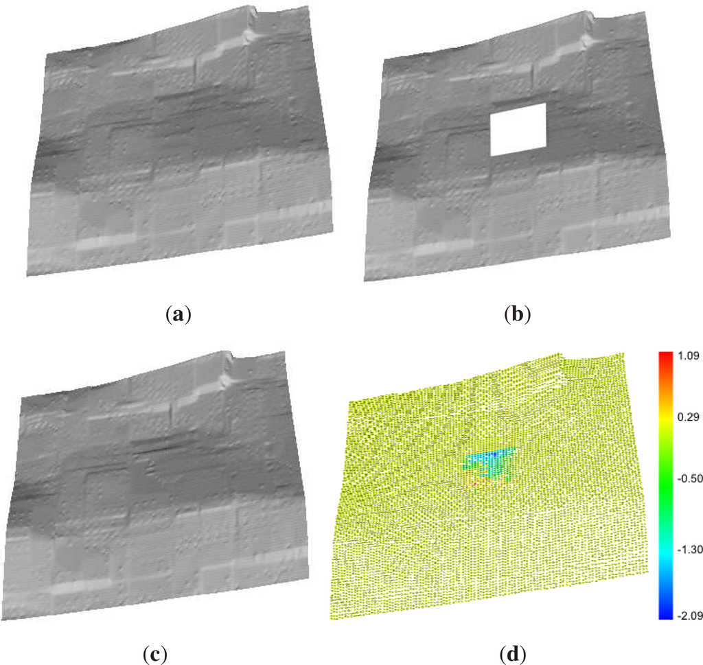 Filling gaps in a DTM on a curved surface on a steep slope: (a) original terrain before a gap is introduced; (b) after a 40 m by 40 m gap has been introduced; (c) after the gap has been repaired; (d) a difference model showing the error in estimation between the original and estimated elevation values. The slope at this location is approximately 33%.