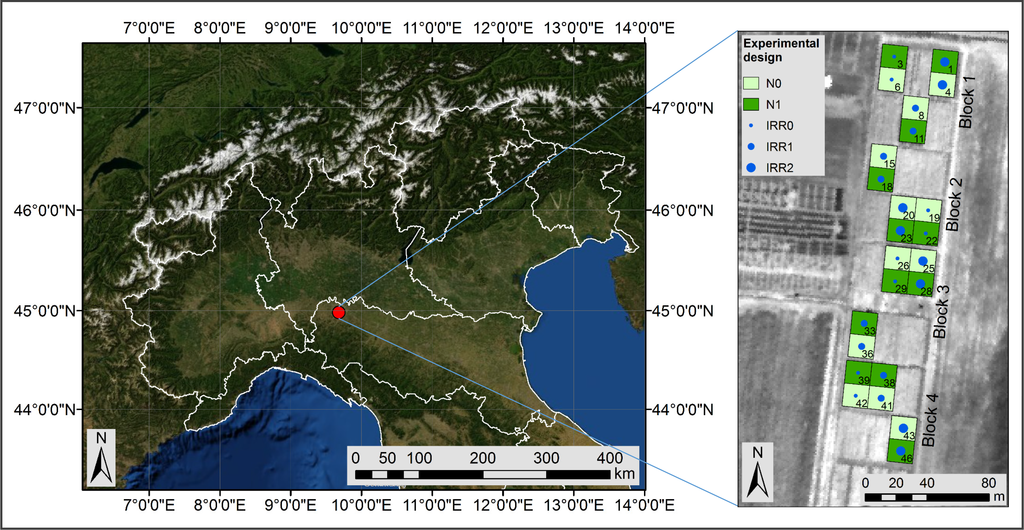 Experimental field location in Northern Italy and treatment scheme. Light green represents the not fertilized maize plots (N0) and dark green the plots treated with 100 kg N ha−1 (N1). The irrigation levels are shown as small circles in rainfed plots (IRR0), medium circles in water deficit plots (IRR1) and large circles in full irrigation plots (IRR2).