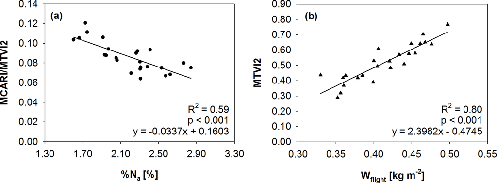 Linear regressions between field data and vegetation indices. (a) %Na and MCARI/MTVI2 (R2 = 0.59). (b) Wflight and MTVI2 (R2 = 0.80).
