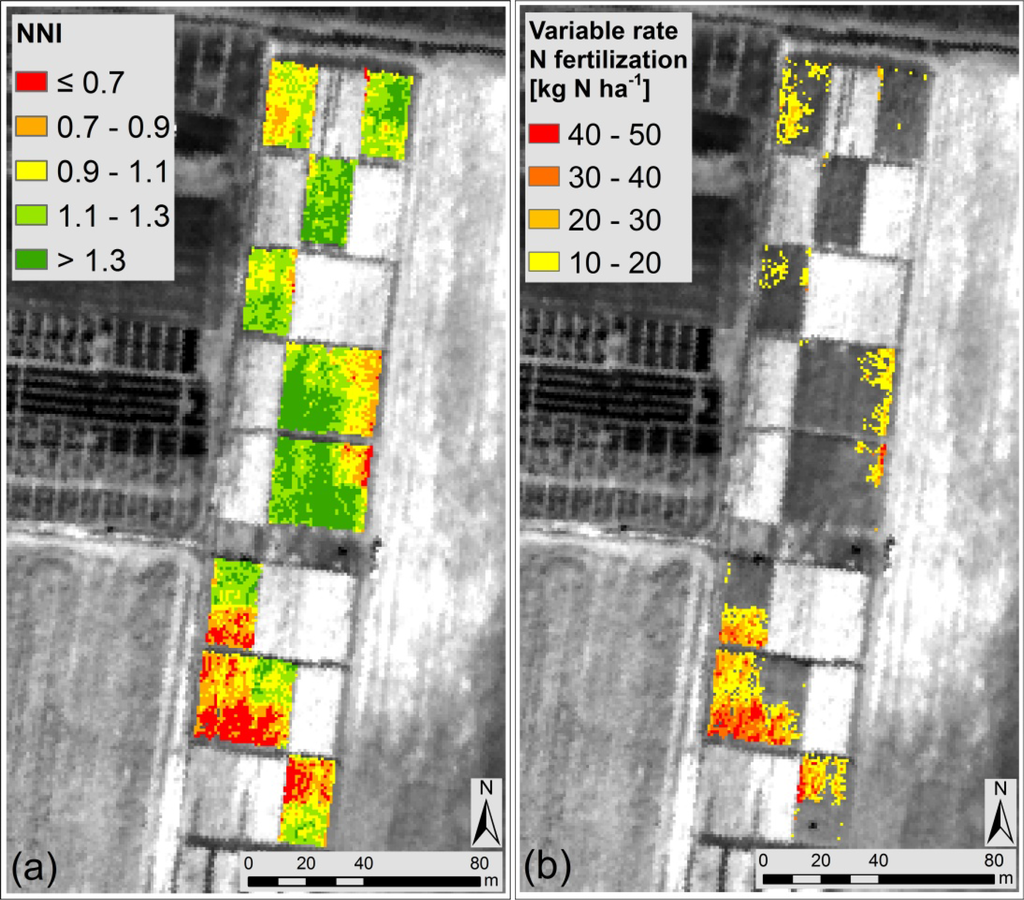 The possibility to map the NNI from airborne hyperspectral data found limited application so far; therefore, this study represents an innovative attempt to produce a variable rate N fertilization map. It should be noted that the integration of radiometric data and crop models addressed in other studies [53] would constitute an approach able to consider also climate and soil conditions.