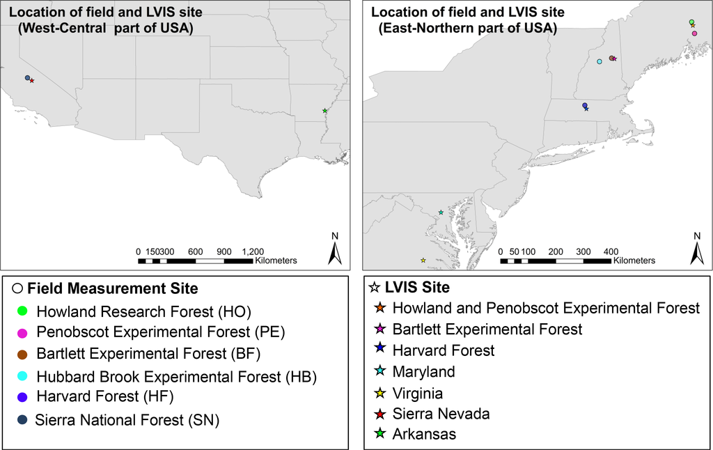 - Cook, B.; Dubayah, R.; Hall, F.; Nelson, R.; Ranson, J.; Strahler, A.; Siqueira, P.; Simard, M.; Griffith, P. NACP New England and Sierra National Forests Biophysical Measurements: 2008–2010; Oak Ridge National Laboratory Distributed Active Archive Center: Oak Ridge, TN, USA, 2011; Available online: http://dx.doi.org/10.3334/ORNLDAAC/1046 (accessed on 15 March 2013).