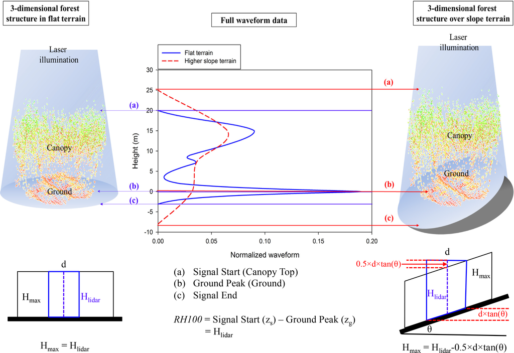 RH100 of waveform can be distorted by terrain slope and off-nadir pointing angle [32,33]. However, we implemented the simpler slope correction approach of Lee et al. [29] with a nadir viewing assumption due to negligible off-nadir pointing angle of both LVIS and GLAS data used in this study. We expected that the higher slopes with larger footprint sizes would lead more interference on the maximum forest canopy height estimation when compared to the lower slopes with smaller footprint sizes. The terrain slope effects on RH100 with nadir-viewing lidar can be expressed by the following equation (see Figure 3):
