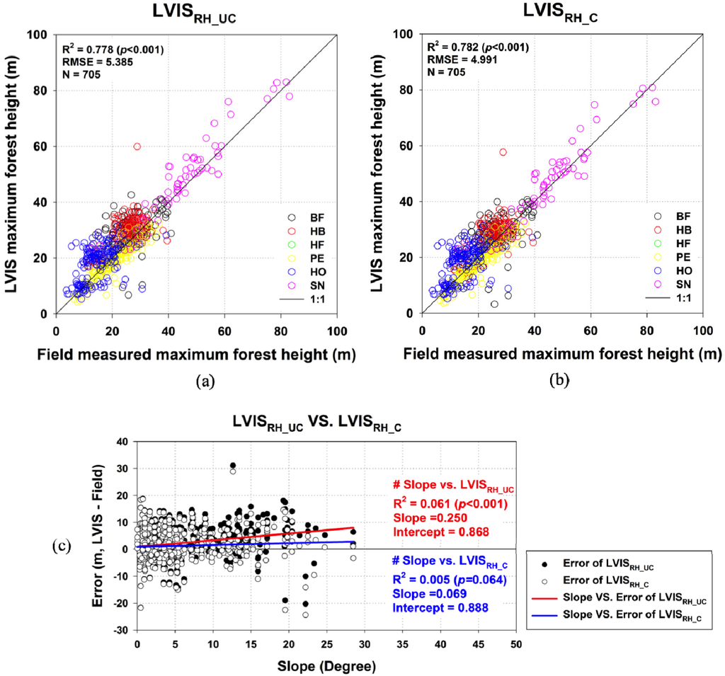 Among 1010 available subplots, 705 valid subplots (i.e., co-located with LVIS shots) were used for the comparison between field measurements and LVIS metrics (LVISRH_UC and LVISRH_C). Table 3 lists statistics for valid subplots and field-measured maximum forest canopy heights. The maximum height of most field measurements (664 subplots) ranged from 5–45 m, but there were extremes in the height distribution (45–80 m) for 41 subplots, which were mostly from mature stands at SN.