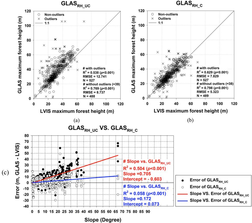 Comparisons of (a) uncorrected (GLASRH_UC); and (b) corrected (GLASRH_C) GLAS metrics against LVIS derived maximum forest canopy heights. Outliers are determined by Cook’s distance threshold (within three times the mean Cook’s distance); (c) Distribution of GLAS height errors by slope gradients. Filled markers with red fitted line represent errors for GLASRH_UC, while unfilled markers with blue fitted line correspond to errors for GLASRH_C.