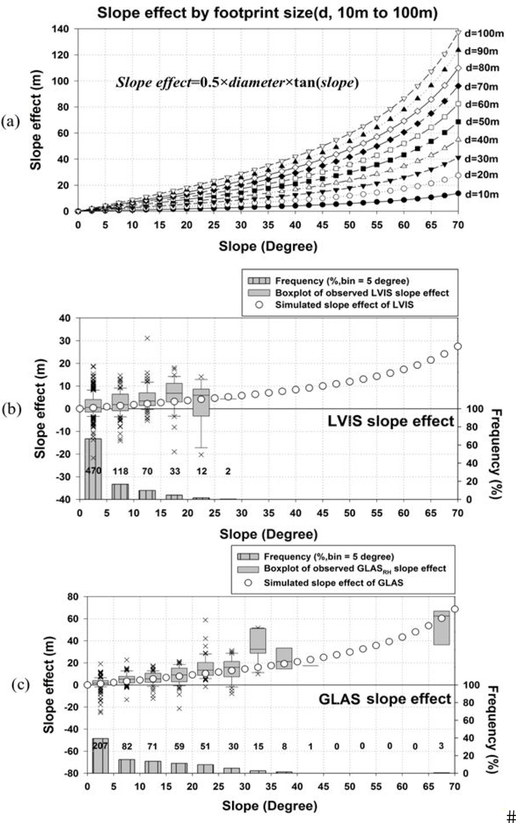 (a) Simulated theoretical terrain slope effects across different footprint sizes (10–100 m) and slope gradients (0°–70°). Errors in slope-uncorrected (b) LVIS and (c) GLAS metrics used in this study along with the simulated slope effects. Bar histograms represent the frequency (%) of LVIS and GLAS data given each slope range (numbers in plot represent number of lidar shots in each bin (not %)). Circles are the simulated slope effects of given footprint size and terrain slope (refer to Figure 6a) and box-whiskers plots correspond to errors in the LVIS and GLAS estimates.