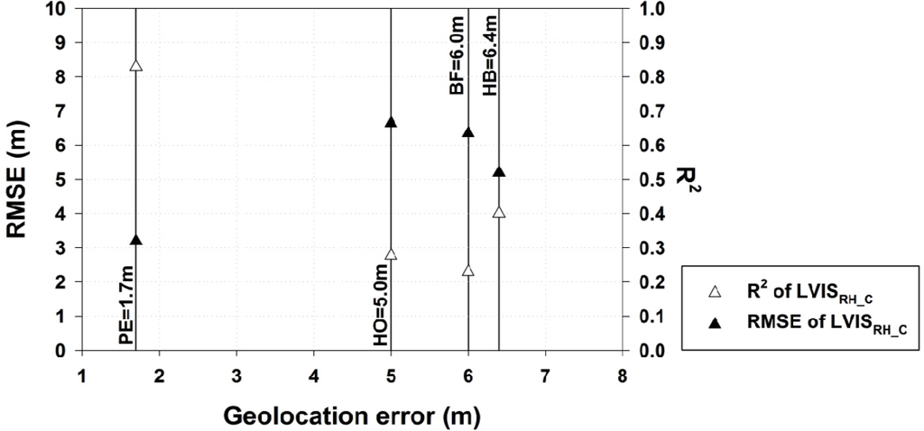 Impact of geolocation errors on overall accuracy of LVIS height retrieval. This comparison includes Bartlett Experimental Forest (BF), Howland Research Forest (HO), Hubbard Brook Experimental Forest (HB), and Penobscot Experimental Forest (PE) sites only (where geolocation accuracy assessments were performed).