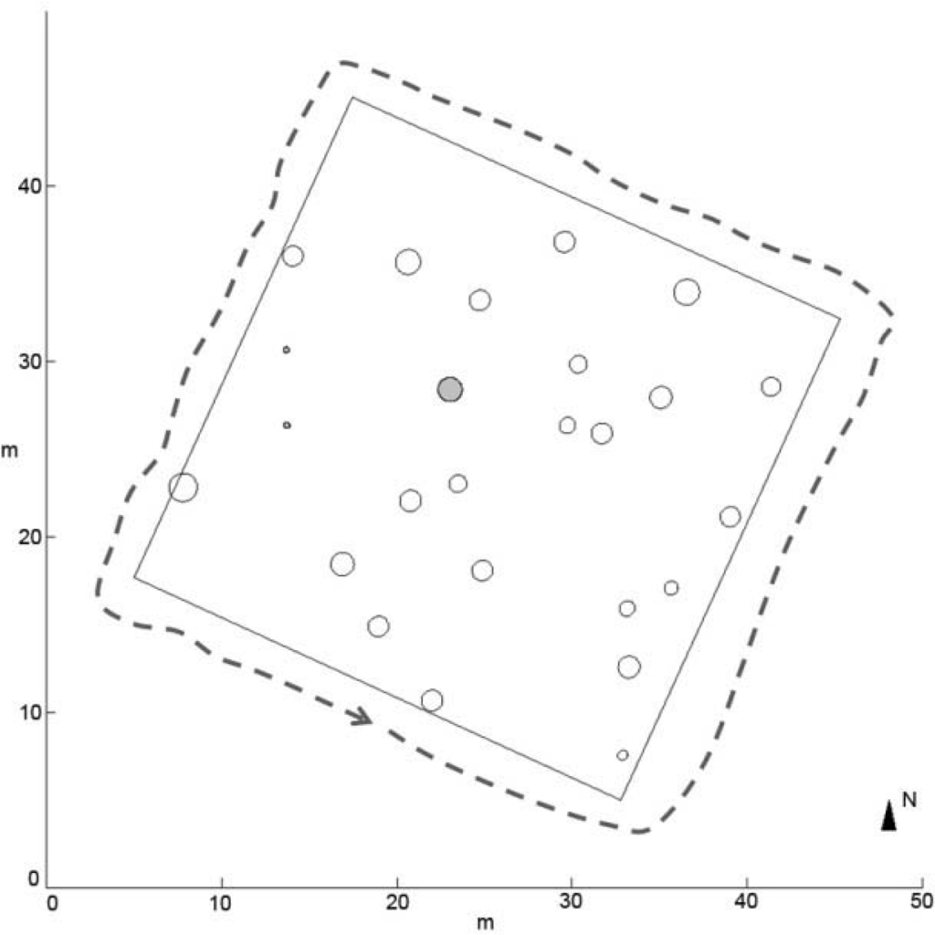 The test forest plot and the photographing path. The square area represents the test plot boundary. The circles and their diameters show the tree locations and the corresponding DBHs. The grey circles indicate deciduous trees and the other circles are pine trees. The dashed lines indicate the photographing path.
