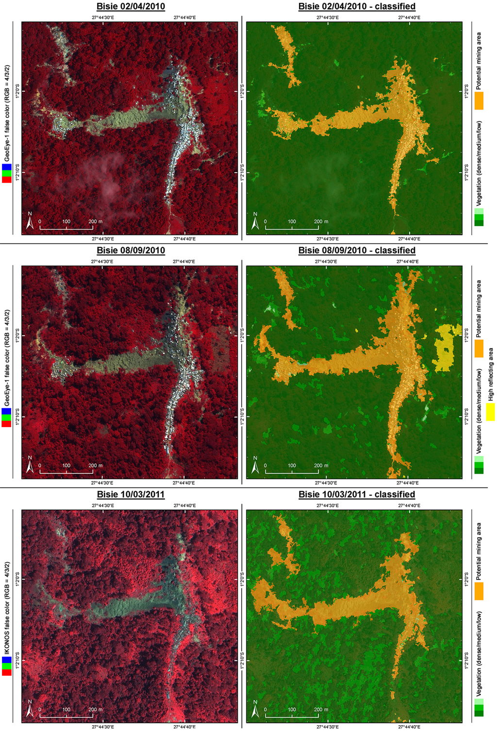With regard to Bisie, it must be emphasized that the first two images were sensed by the GeoEye-1 satellite, while the third image was gathered by the IKONOS sensor. Thus, the spatial resolution and hence the resolution of the classification results differ between these data sets. Figure 10 shows the unclassified images and the classifications at three different points of time. Within all classifications the larger structures and dwellings on the eastern topside of the hill have not been classified explicitly. Owing to their immediate vicinity to the mining site taking into regard the focus of this study, it is estimated that they form part of the on-site infrastructure.