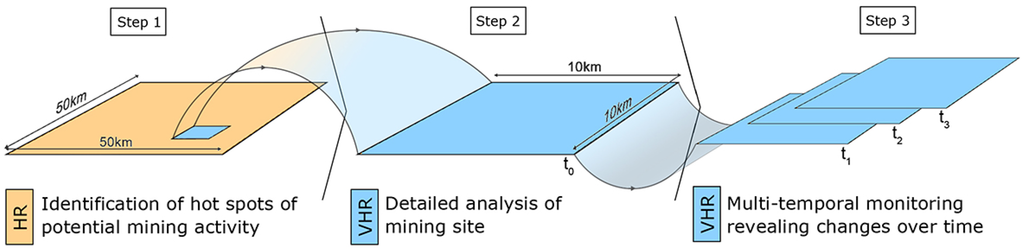The first step is to analyze HR imagery to ensure the coverage of large survey extents for the detection of potential mining areas. Subsequently, VHR imagery is analyzed to investigate the previously defined “Region Of Interest” (ROI) in high detail. The final step is to conduct multi-temporal monitoring of the detected areas of potential mining on VHR data. This procedure is shown in Figure 4.
