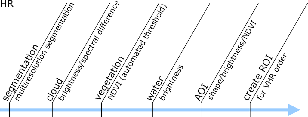 At the beginning of the HR analysis, the creation of objects by means of a multi-resolution segmentation is carried out [43]. Since the potential mining areas consist only of few pixels within HR imagery, small objects are considered to be more suitable for the detection of potential mining sites. Thus the segmentation scale is adjusted to create small objects. This also explains the reason why coarser, medium-resolution satellite imagery is not suitable for the purpose of this study. The detected areas of interest (AOI) are of fairly small size and therefore we assume that less than 10 m of resolution is about the limit for detecting these small objects. The subsequently elaborated classes are used to create areas to be excluded from further analyses, such as dense forest, clouds or water bodies (cf. Figure 5).