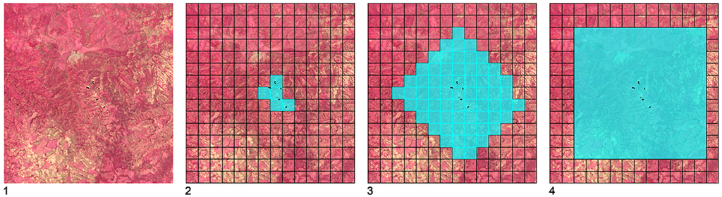 The complete growing process is visualized in a series of stages in Figure 6. Starting with the deletion of the exclusive classes in (1), a rectangular segmentation with a border length of approximately one kilometer is created. Those cells containing one or more AOIs (2) are defined as the starting point for the subsequent growing process (3). Region growing is performed in all directions resulting in a rhombus. In order to restore a rectangular ROI, all unclassified tile sizes which share at least 50% of their border with a tile size classified as ROI are also classified as such. Part (4) depicts the result: A rectangular ROI, approximately 10 km × 10 km in extent, including the areas of interest precisely in the centre. These squared ROIs constitute the basis of a request for VHR imagery, for which the minimal size to be ordered is 100 sq km. In terms of a service workflow, automated region deliniation is highly valuable.