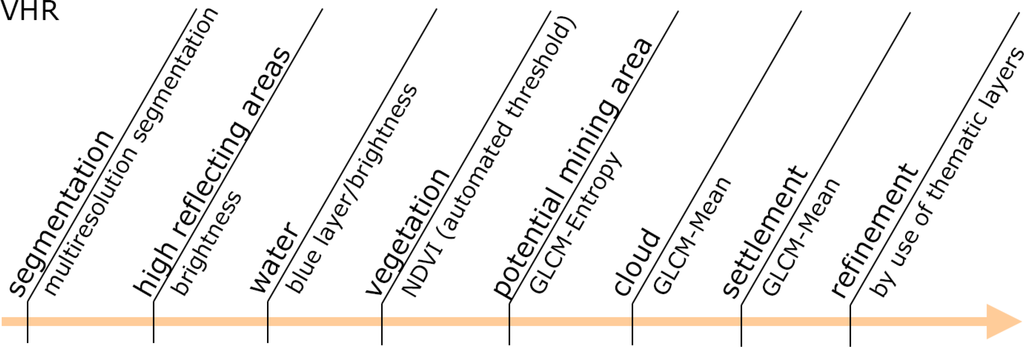 The illustrated workflow contains a further development of the multi-scale image analysis approach conducted in [20]. Schoepfer and Kranz [20] focused on the conceptual design of the approach. In their study, a basic land cover classification on the HR data was performed to assess the potential of the workflow without performing a detailed analysis of the VHR data. Within this preliminary study the potential of the overall concept was proven, thus in the present study, the whole workflow was applied based on [48], i.e., identification of potential mining areas within the HR data and a detailed assessment of two mining sites by the analysis of VHR imagery. Conducted in the rule-based classifier environment of eCognition8, the innovative aspect of the approach is the design of the rule-sets.
