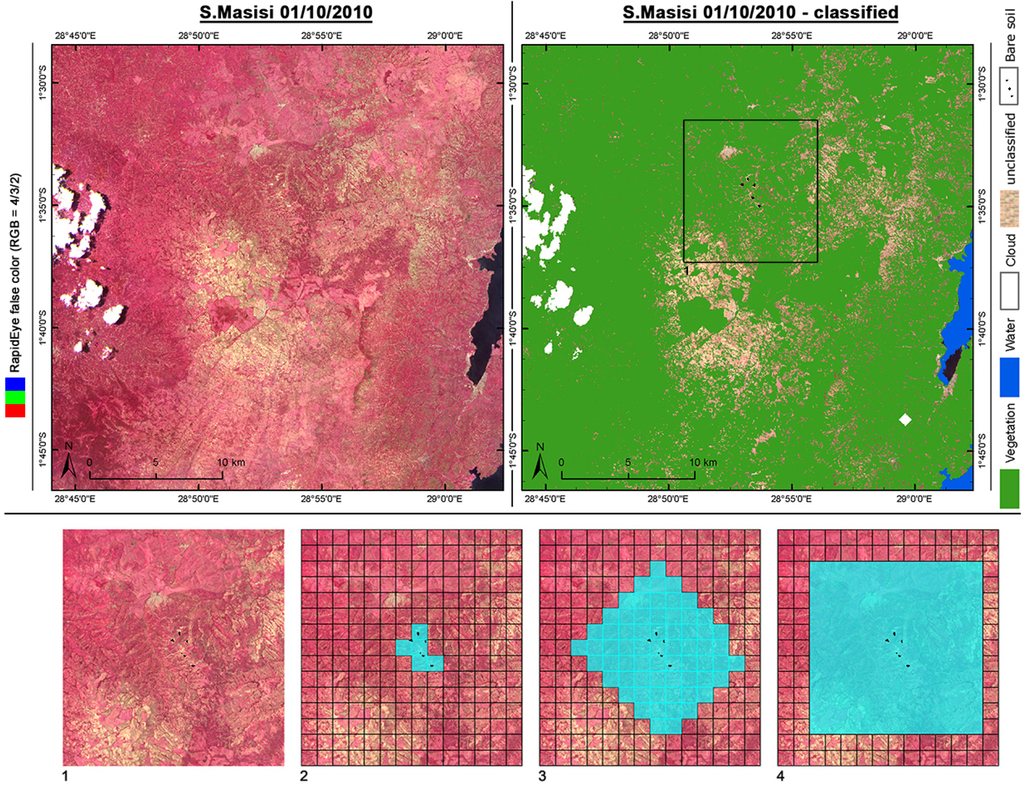 In Figure 8, the detailed classification of water, clouds and vegetation of the imagery for Southern Masisi is shown while the not classified areas are the remaining parts from the classification of exclusive classes. It is assumed that bare soil areas detectable with HR data are with high probability related to areas where mining could take place but they are not per se potential mining areas. Thus, a more sophisticated classification has to be conducted. Since ASM techniques are the most common methods of mineral extraction within the study area, mining sites are constituted only by few pixels on HR data with a respective resolution of 6.5 m. To tackle this challenge, an initial segmentation scale is applied which generates objects of the size of typical ASM mining locations in the region. The respective segmentation scale is assessed with expert knowledge. The resulting potential mining areas do not represent mining sites only, but also pure bare soil areas. Thus, a visual interpretation with expert knowledge or a comparison with on-site information is necessary to refine the classification result.