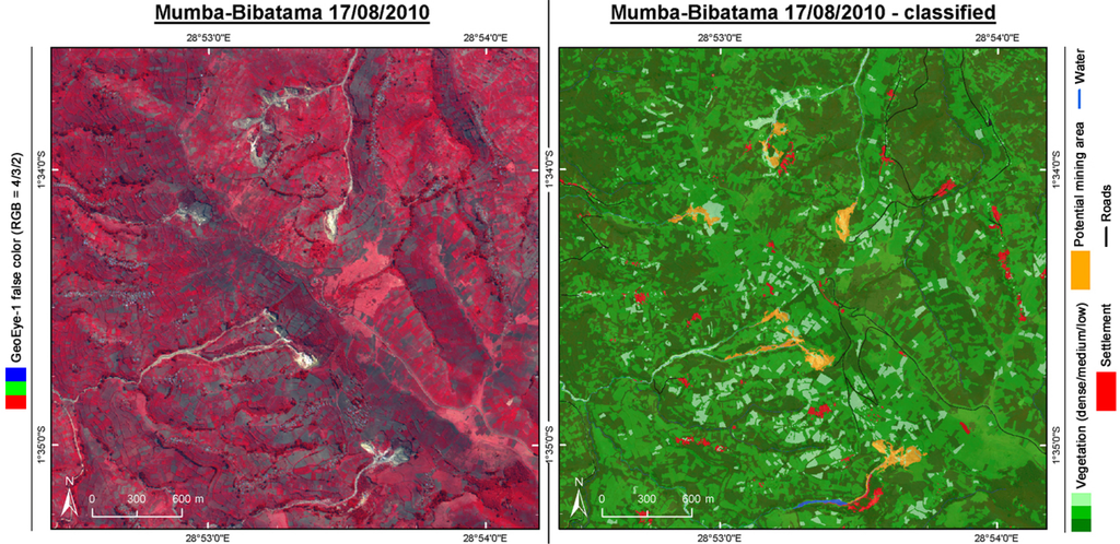 The mining site—mainly composed of bare soil and located in close proximity to dense forest—is captured almost to the full extent. Smaller areas of bare soil found in the adjacent rainforest are also captured and classified as potential mining areas. However, not all mining areas are identified, which is reflected in the classification accuracy values listed in Table 3. The classification result for the 8 September 2010 shows an additional clearing area to the east of the hill crest. The clearing area can be interpreted as an area where firewood or building timber is harvested. The most recent satellite imagery of the mining area of Bisie is shown in the lower part of Figure 10. It is noteworthy in the case of this image that the resolution is half the value of the two preceding images, which poses problems especially with regard to monitoring. Despite the considerable reduction in details in the image, which aggravates the classification process, the latter produced satisfying results for the image of the 10 March 2011, as confirmed in Table 3. Thus, it can be stated that, for the study at hand, the transferability and interoperability of the rule set between the different resolutions and sensors is proven.