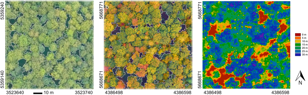 So far, the spatial distribution of gaps has seldom been quantified in a spatially-explicit manner (but see [,,]). One obvious reason for this is that terrestrial mapping of the patterns of gaps is very time-consuming and, thus, done rarely on continuous neighborhood scales. Another reason is that the resolution of conventional aerial (20 cm/pixel) or satellite images (≥50 cm/pixel) is too coarse to permit delineating gaps as small as 1 m2. However, some ecological phenomena, such as the canopy-structural dependencies of certain understory species, are only observable at small scales and, hence, only quantifiable if enough gaps would contribute to the small-scale spatial pattern analysis. Here is the advantage of using unmanned aerial vehicles for the mapping of gaps. Images taken at low flying altitudes have such a high resolution (usually <10 cm/pixel), that minimal gap sizes of 1 m2 and their shape can be safely mapped and included in the data set for assessing gap distributions. This inclusion of the smallest gaps will not only lead to a sufficient sample size to permit spatially-explicit analyses, but also, to new possibilities of ecological inference.