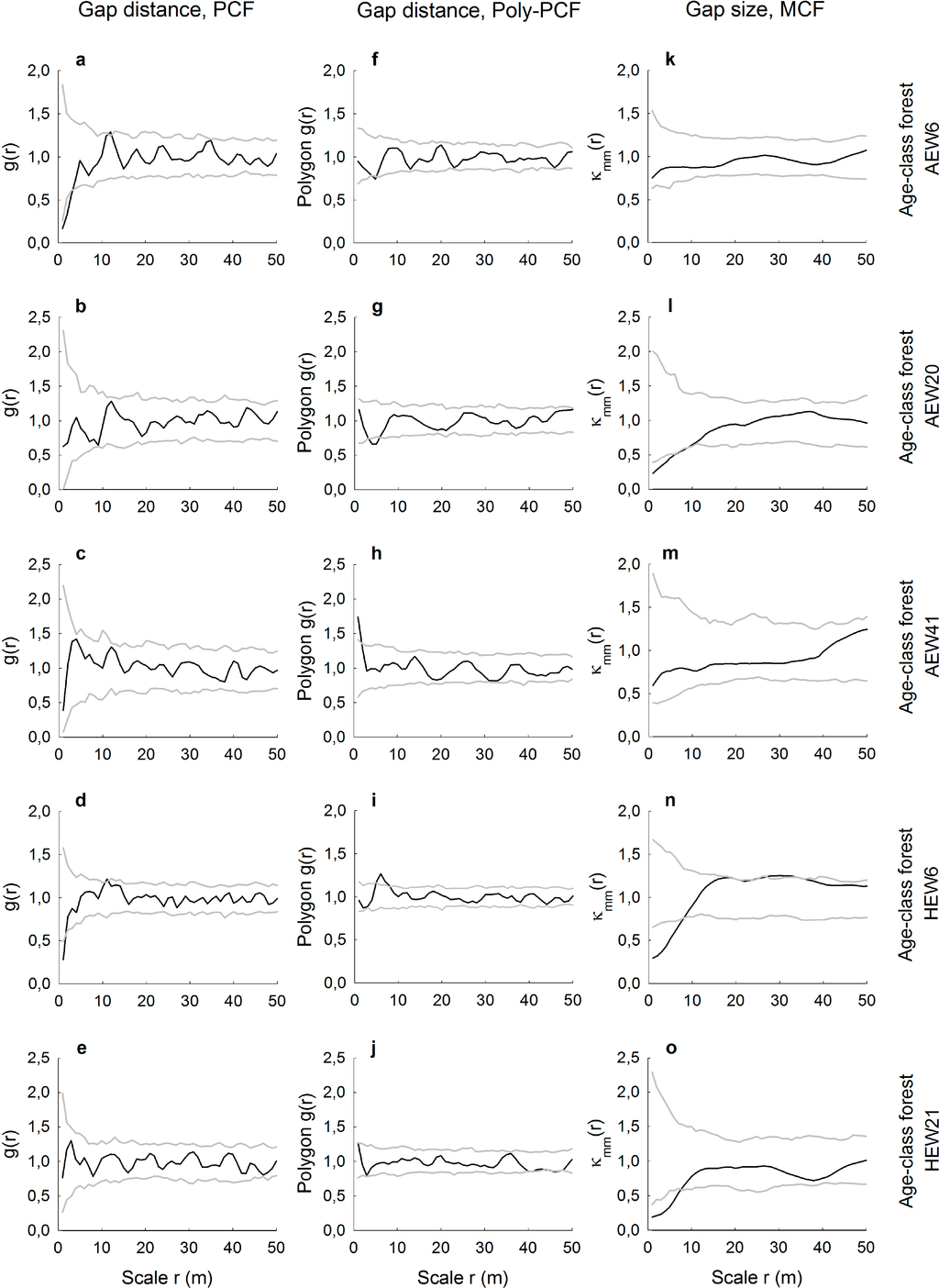 For the five age-class forests, gap distributions analyzed with the conventional pair correlation function revealed for three plots random spatial patterns and two plots small-scale regularity (Figure 3a–e). The same plots analyzed with the polygon-based PCF showed contrasting results (Figure 3f–j). For example, there was small-scale regularity (AEW20 plot) or aggregation (AEW41), even though the conventional PCF indicated randomness. In terms of indicating deviation from the null model of complete spatial randomness, results obtained with both types of pair correlation functions differed in four out of five age-class forests. There was only general agreement for the plot HEW21 (Figure 3e,j). The mark correlation function indicated for the five age-class forests that gap sizes (areas) were uncorrelated in two plots, but negatively correlated up to a maximum of 9 m in three plots (Figure 3k–o).