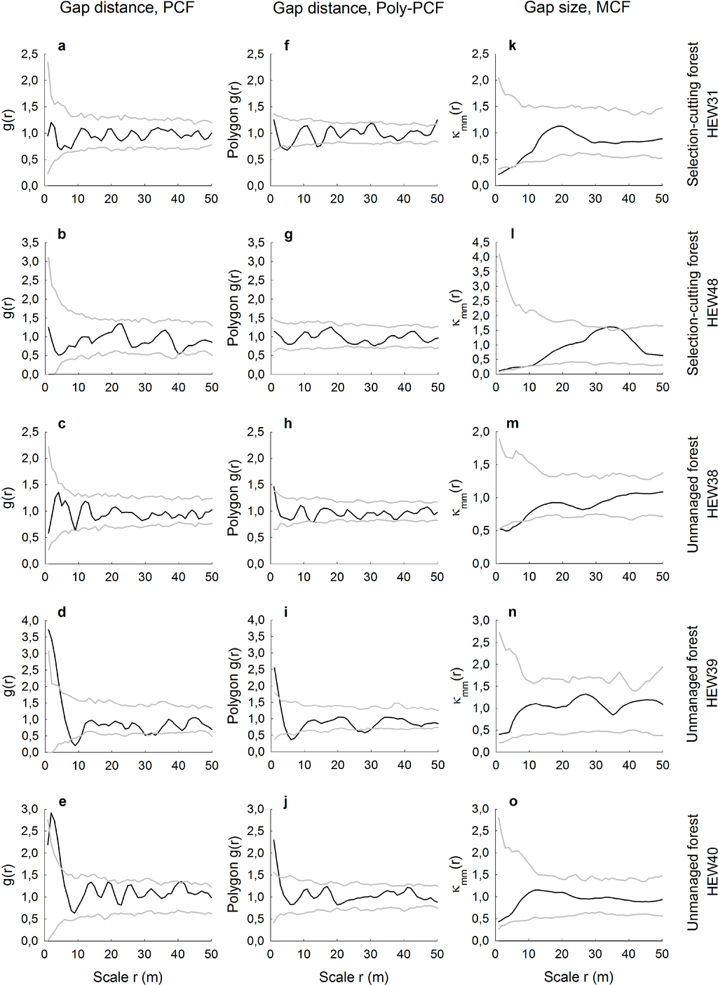 We applied three spatial correlation functions for the analysis of gap distributions. At first, we used the “conventional” pair correlation function (PCF) to assess whether gap patterns were random, aggregated or regularly spaced at continuous neighborhood scales up to r = 50 m. For analyses with the conventional PCF (and the mark correlation function (MCF), see below) we used the center of mass of the gap polygons as the x,y-location. The pair correlation function g(r) is the expected density of points at a given distance r of an arbitrary point, divided by the intensity λ of the pattern []. The PCF is non-cumulative and, thus, particularly suitable to reveal critical scales of the pattern [,]. Under complete spatial randomness (CSR), g(r) = 1. Values of g(r) < 1 indicate regularity, while values of g(r) > 1 indicate aggregation.
