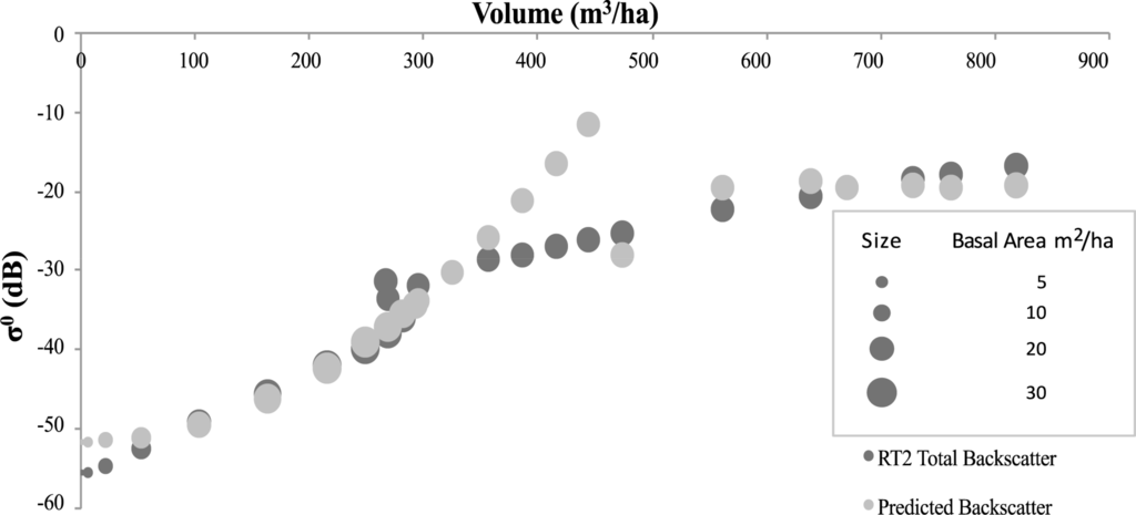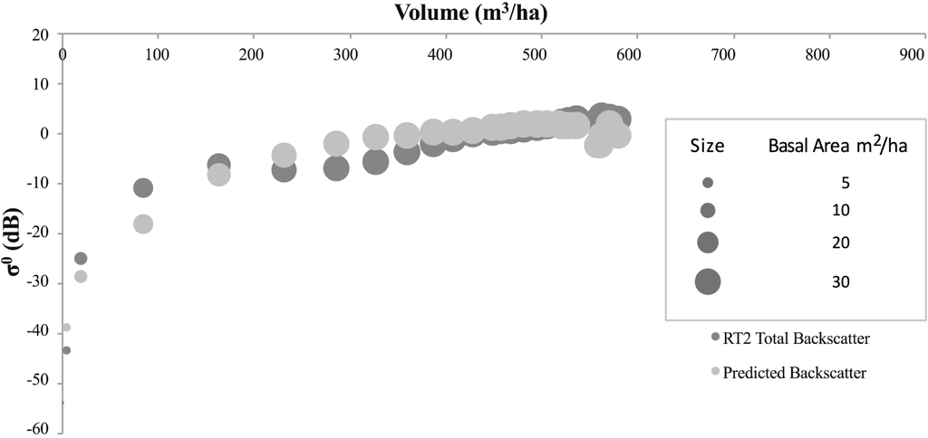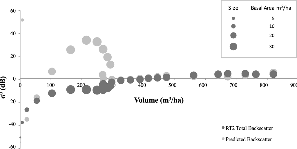 Although the general saturation curve with increasing volume is manifest in each dataset, the effect of a rapidly increasing basal area and the subsequent drop off to a more sustainable level appears to have a profound effect on backscatter. In a similar way to that seen in Baker et al. [49], it would appear that single species gymnosperm forests have a tendency to overstretch their resources in terms of basal area accumulation per area. In Figure 4 this area of change is shown to coincide with the fluctuation in backscatter around 270 m3/ha shown for the RT2 modelled backscatter data. This occurrence highlights how “self-thinning” and basal area may directly influence backscatter levels.