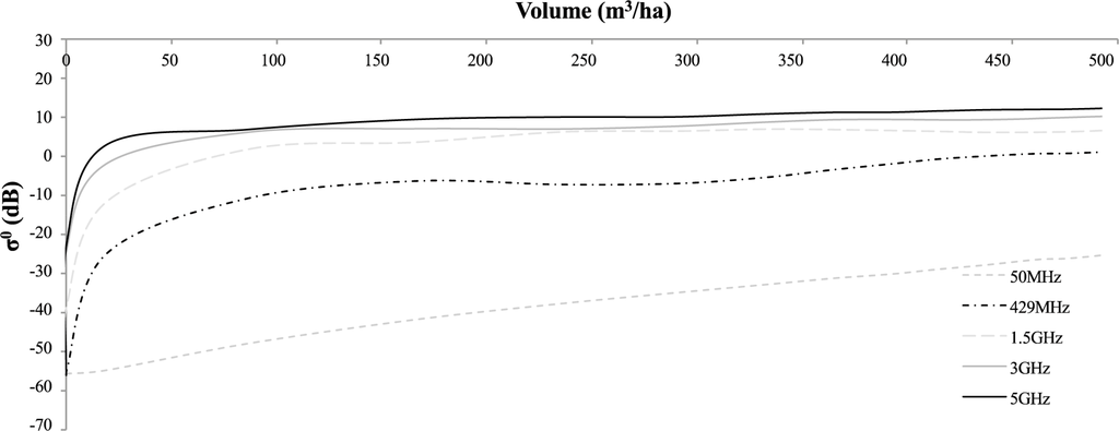 Multifrequency backscatter analysis of the mixed species forest of scenario (c) from Section 3 is visualised in Figure 12. The expected trend in backscatter behaviour is exhibited with saturation occurring at higher volumes for lower incident frequencies with the highest frequencies, as expected, producing the highest intensity of backscatter. Of particular interest is the fact that this typical behaviour is exhibited in the absence of canopy attenuation with saturation exhibited within the volume range of 0 to 500 m3/ha for frequencies from 5 GHz (C-Band) down to 429 MHz (P-Band). Low saturation volumes apparent here can be explained by the consistency in basal area following transition to Optical scattering which occurs at lower volumes for higher frequencies due to increasing sensitivity to smaller scatterers. The 50 MHz data (VHF) on the other hand does not show saturation behaviour within the displayed volume range. This is in accordance with the simplistic model theory that suggests a transition of dominant Rayleigh scattering to Optical scattering at much higher volumes than for the other frequencies shown.