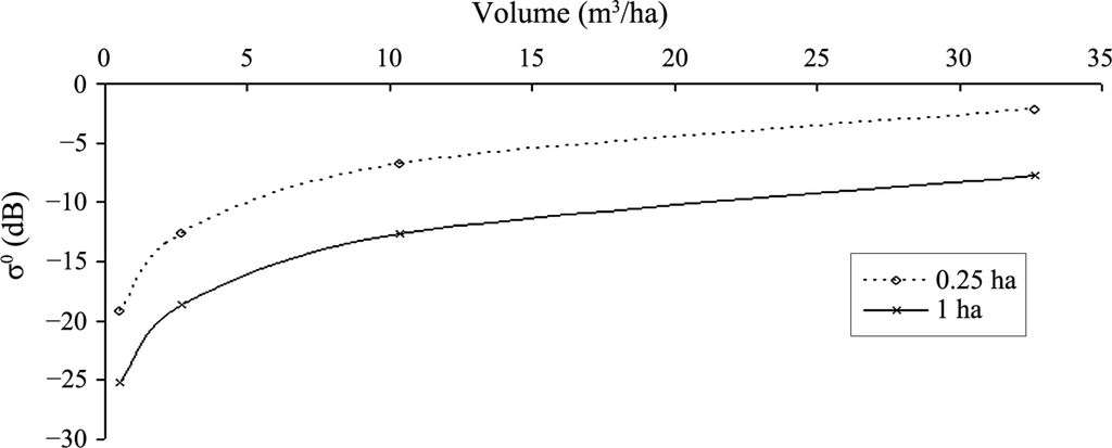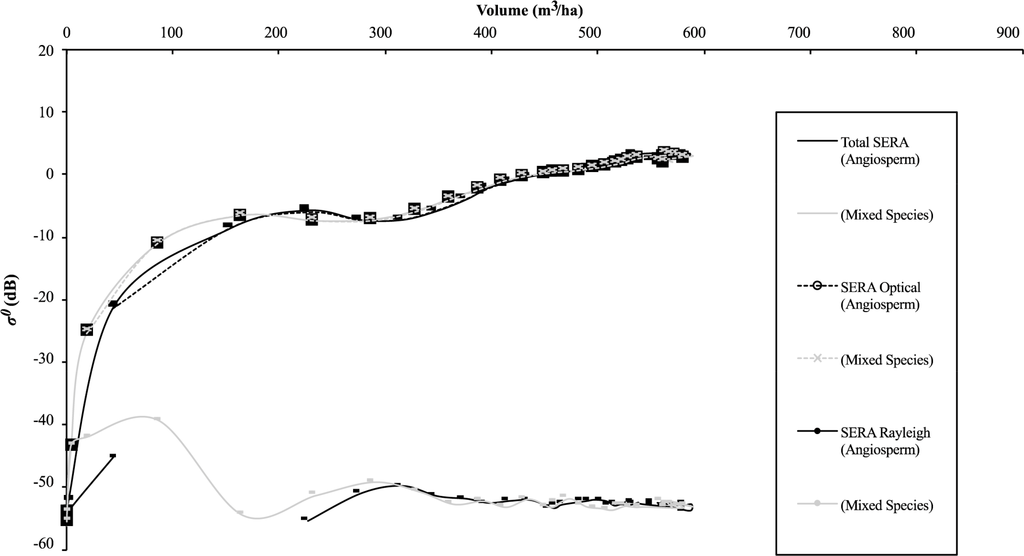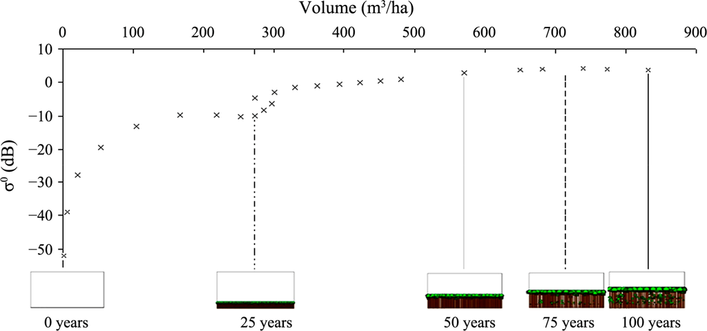 In this study the frequency 429 MHz (P-band) is the principal frequency of investigation with a wavelength of 0.7m. Many studies have quoted this frequency to saturate at between 100 to 200 t/ha (approximately 167 m3/ha–333 m3/ha) [44], but as the theories presented in this study would suggest, these saturation figures are not dependent solely on the biomass of the forest, but also on the size of its constituent components and the methods that control size dynamics (i.e., human, or natural thinning). In a typical forest 333 m3/ha represents a biomass at which the forest has had several years of growth and has become mature and climactic. When a forest has achieved this status the most consistent forest parameter is the total basal area over time of the stand. Using SERA [12] and simulating, from conception, 3 separate forest environments consisting of Abies alba (a), generic gymnosperm (b) and a forest consisting of mixed species (c), each forest has shown that for this volume the change in basal area per year of growth is less than 1% every year. With the nature of Optical scattering being proportional to the basal area increase of the stand, when stem length is proportional to diameter [32,35], the backscatter would be expected to saturate if the rate of increase of basal area with volume stagnates in a purely Optically scattering environment. According to Equation (2) the theory suggests that if there is no increase in basal area then there will be no increase in backscatter. This statement is indeed true in the idealistic scenario of the forest being entirely devoid of Rayleigh scatterers, but with the existence of regrowth in each of the simulated forests there remains a small contribution from Rayleigh scattering proportional to its volume squared [6] (Equation (1)). Additionally in the natural world the presence of dead wood and Rayleigh scatterers in the canopy, both not considered here by SERA, will contribute to the total backscatter, thus causing further deviation from the theory. Due to the nature of Rayleigh backscatter, small increases in volume will result in a much greater increase in backscatter than that caused by similar basal area increases although their net contribution will be smaller also [10]. Hence it remains a possibility that modelling forests devoid of canopy may produce what appears as complete saturation. The more likely scenario is that the dynamism of a forest in the modelled and more significantly in the natural setting will prevent complete saturation.