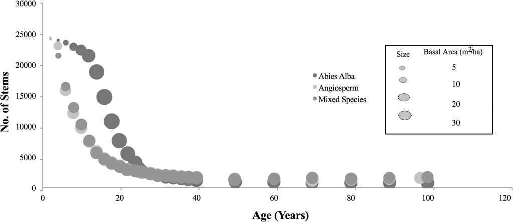 Each modelled forest examined in this study is based on an initial planting density of 25,000 trees, to mimic the planting conditions of the empirically monitored forest of Abies alba referred and compared to in the initial SERA publication [12]. The numerical description of the forest dynamic over time is given in Table 1 for scenario (a). The data from this table representing backscatter against volume per ha are plotted in Figure 4. Figure 5 shows how the number of trees and total basal area in each forest composition vary over time.