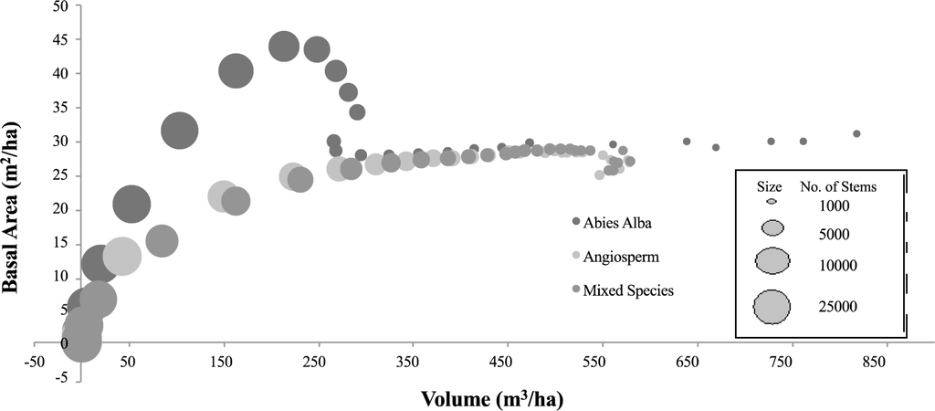 The similarities and differences in the backscatter of the three data sets (scenarios (a), (b), and (c)) can be related to both Figures 5 and 7 showing how basal area and volume fluctuate but also how the stem numbers thin with age. The differences between Abies alba and the other cases are obvious, particularly over the first 30 years of growth (up to 300 m3/ha) when the recorded basal areas reach unsustainable levels before a reduction to values comparable to Angiosperms. With regard to the importance of volume and basal area in determining saturation, SERA predicts that forests (through the trees within them) consistently grow to reach an optimum condition. This relationship between the optimum basal area and volume of particular species can be seen in Figure 7. As the dominant species in the mixed forest is the Angiosperm it is no surprise that the cases of Angiosperm and Mixed species data converge at higher levels of basal area and volume. The Abies alba data on the other hand shows the behaviour seen in mono species gymnosperm plantations of over extension in terms of basal area and then rapid die back [49] suggesting less nutrient requirements per tree at younger ages. Correlation between volume and basal area is still evident between the different species in Figure 7 but only at volumes below 100 m3/ha and then again above 300 m3/ha. Overall, from the forest data produced by SERA, a particular stand area has the ability to sustain a much larger volume of Abies alba than the Angiosperm species, with the Angiosperms appearing to reach their optimum/maximum volume at approximately 550 m3/ha while Abies alba for the same area does not reach its optimum within the 100 year study limit. As for basal area, for each case the optimum basal area is in the region between 25 m2/ha and 30 m2/ha with a reduction in basal area only occurring if the optimum/maximum volume has been reached or basal area over extension occurs. In scenarios such as this the constraint in volume appears to dominate over basal area. With height continuing to increase, the forest must therefore scale back in number density to avoid exceeding this optimum volume value.