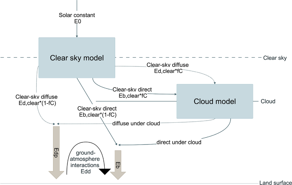 We use an existing high-performance clear-sky model to estimate the incident solar radiation under the clear-sky conditions. The model, REST2, is a two-broadband model that has been well parameterized and validated [34,37]. Band 1 covers the UV and visible (VIS, 0.29∼0.70 μm) and Band 2 covers near-infrared (NIR, 0.7∼4 μm). REST2 is designed in a simple radiative-transfer manner to estimate both direct beam and diffuse radiation under cloudless condition, which are calculated as functions of individual transmittance and scattering coefficients of major atmospheric constituents (well-mixed gases, ozone, nitrogen dioxide, water vapor and aerosols). The model uses the latest solar constant value at the mean solar-earth distance as the extraterrestrial solar radiation and calculate the incident direct beam radiation under clear sky (Ebi,clear) as for each of the two band i as: